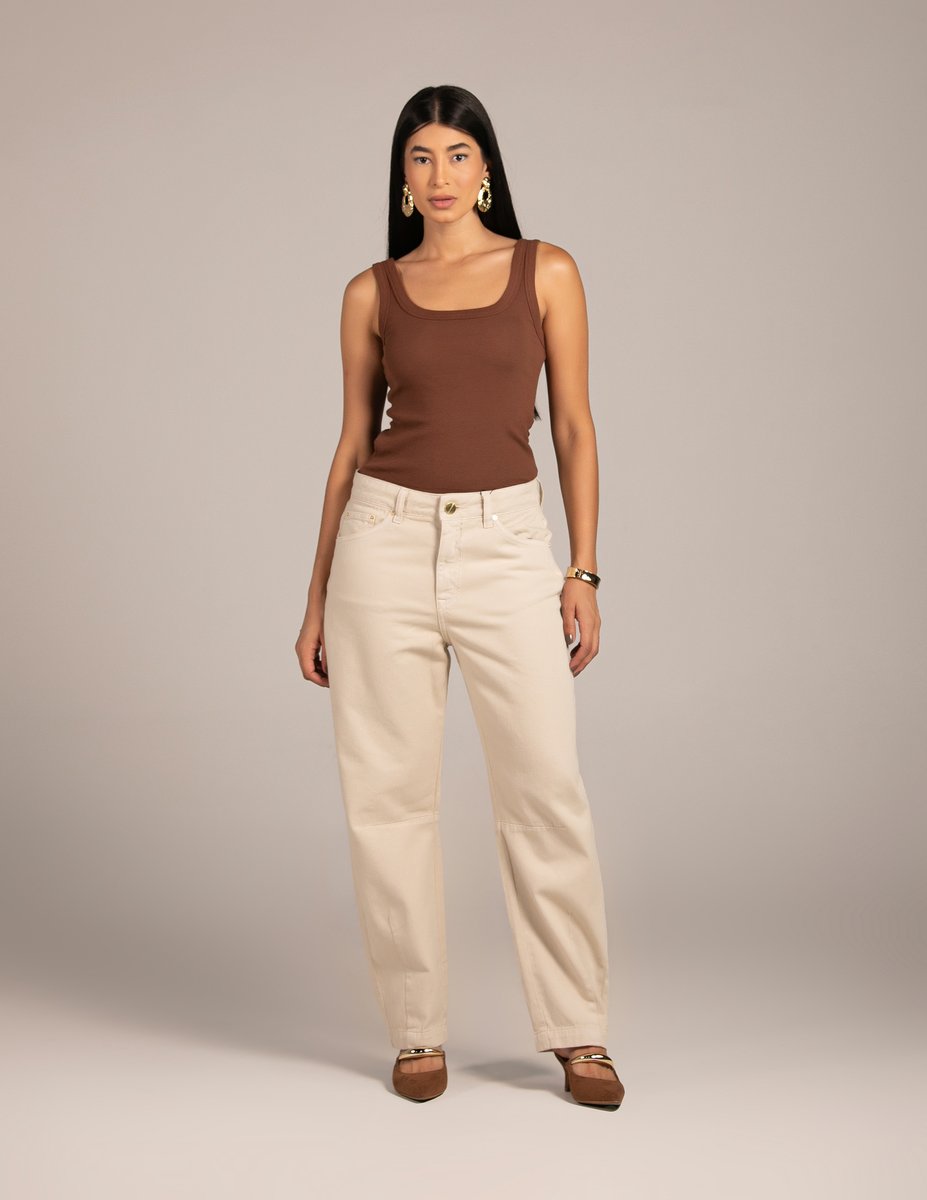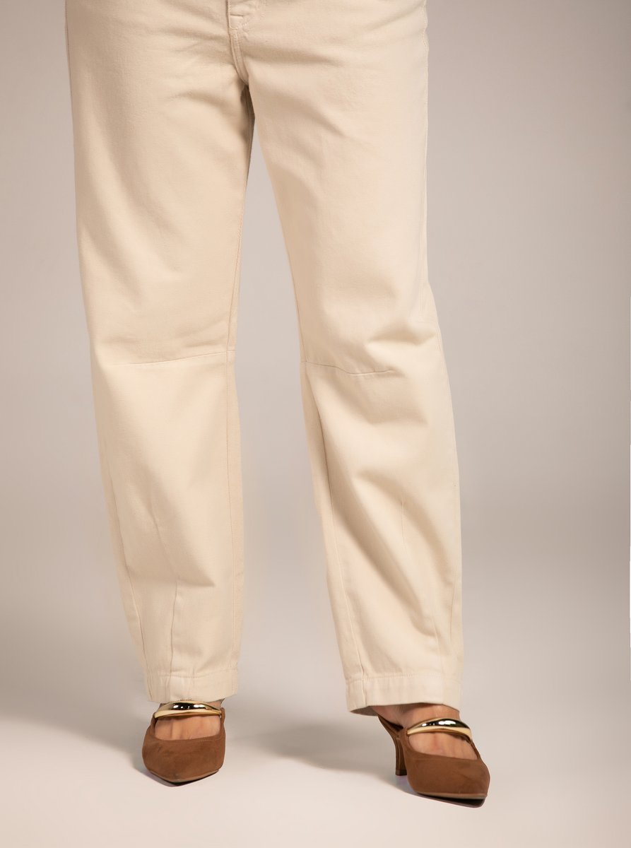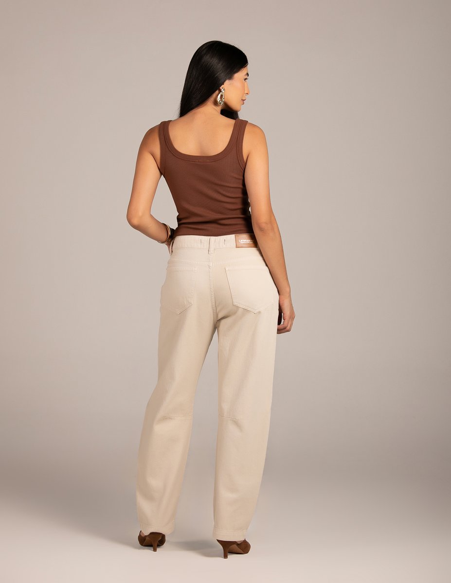 A Calça Feminina Barrel Off White da Latifundio Jeans foi desenvolvida para quem busca um visual moderno, estruturado e cheio de personalidade. Confeccionada em sarja 100% algodão, oferece conforto ao uso e um caimento firme, realçando a modelagem característica do estilo barrel, com volume suave nas pernas e afunilamento próximo ao tornozelo.