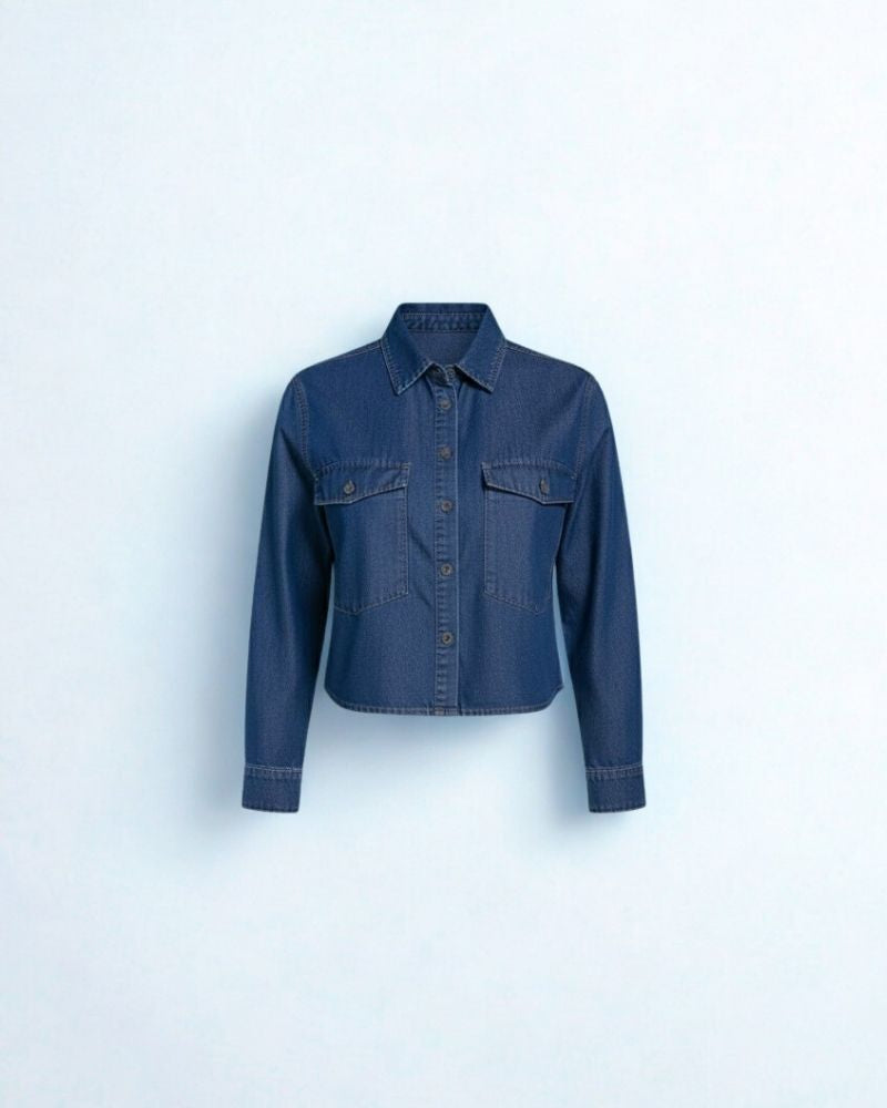 Seu design cropped valoriza a silhueta com elegância, enquanto o jeans médio traz um visual atual, capaz de transitar facilmente entre produções casuais e arrumadas. Com detalhes que reforçam a autenticidade do jeans e acabamento refinado, esta camisa entrega um equilíbrio perfeito entre sofisticação e estilo despojado.