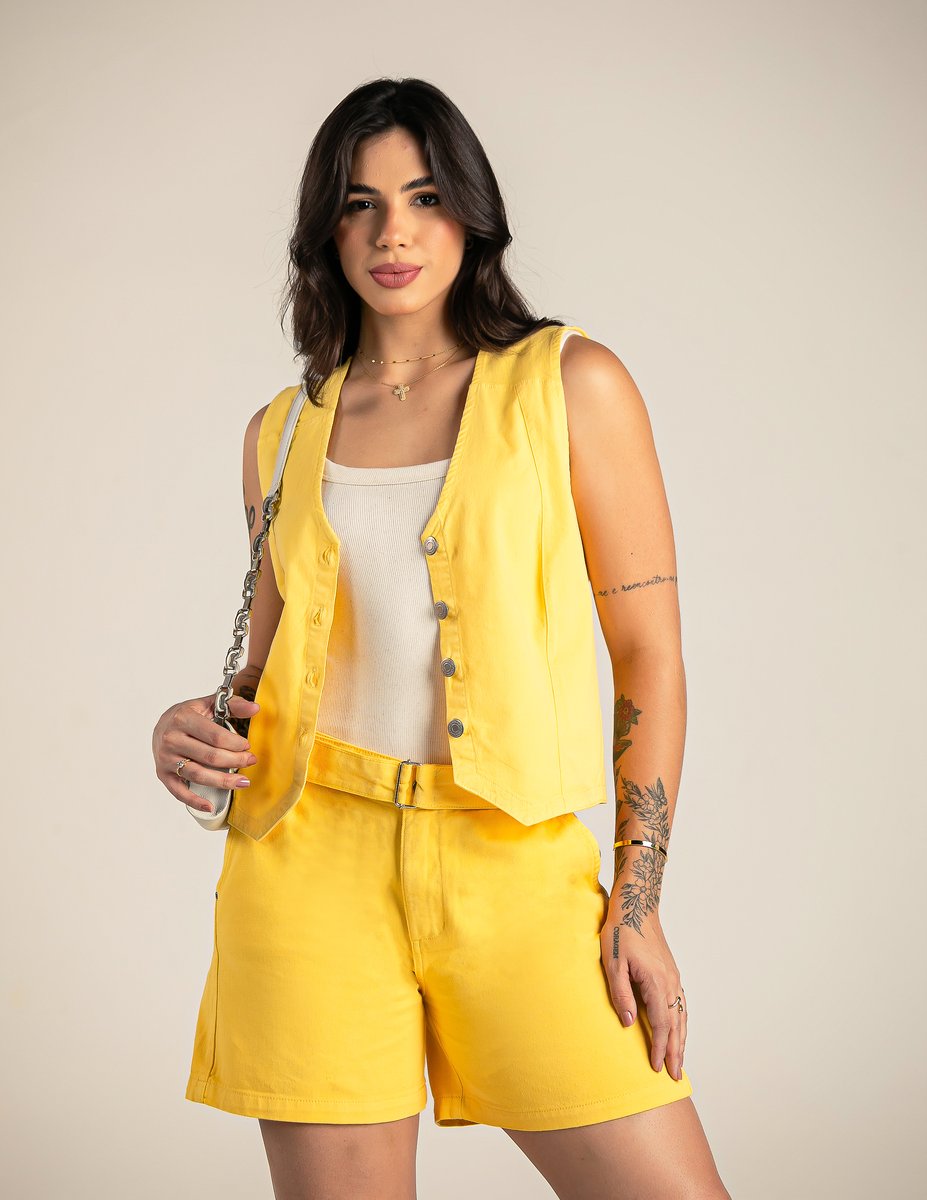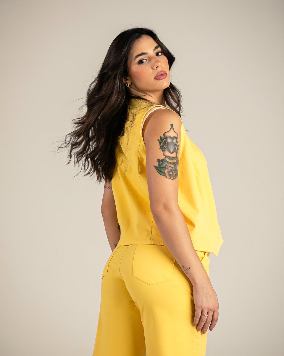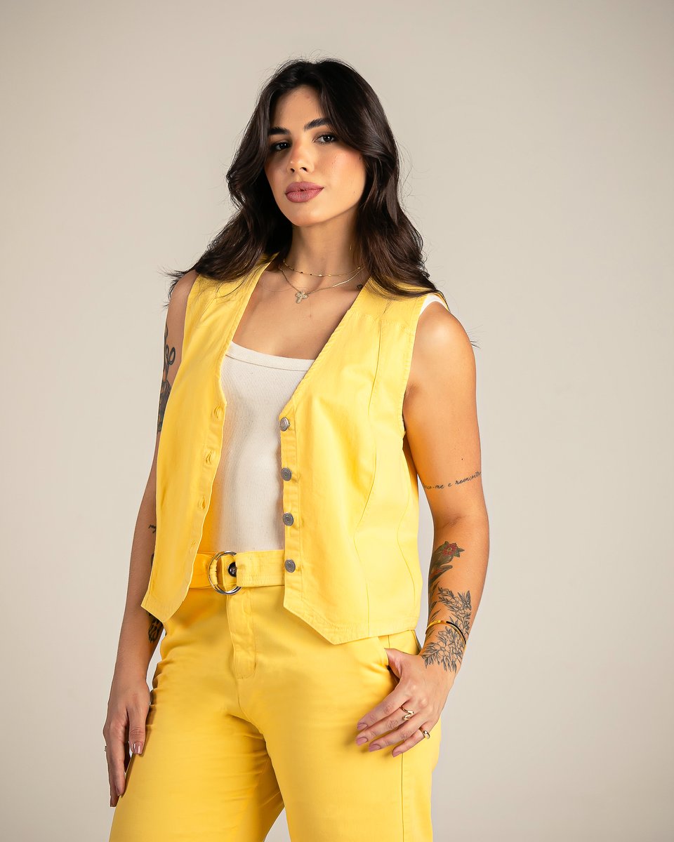 Confeccionado em tecido de alta qualidade, com 98% algodão e 2% elastano, o colete oferece toque macio, excelente caimento e leve elasticidade, garantindo conforto e liberdade de movimento ao longo do dia. Sua modelagem ajustada valoriza a silhueta feminina sem restringir o uso, enquanto a tonalidade amarelo traz leveza, modernidade e fácil combinação com diferentes cores e estilos.