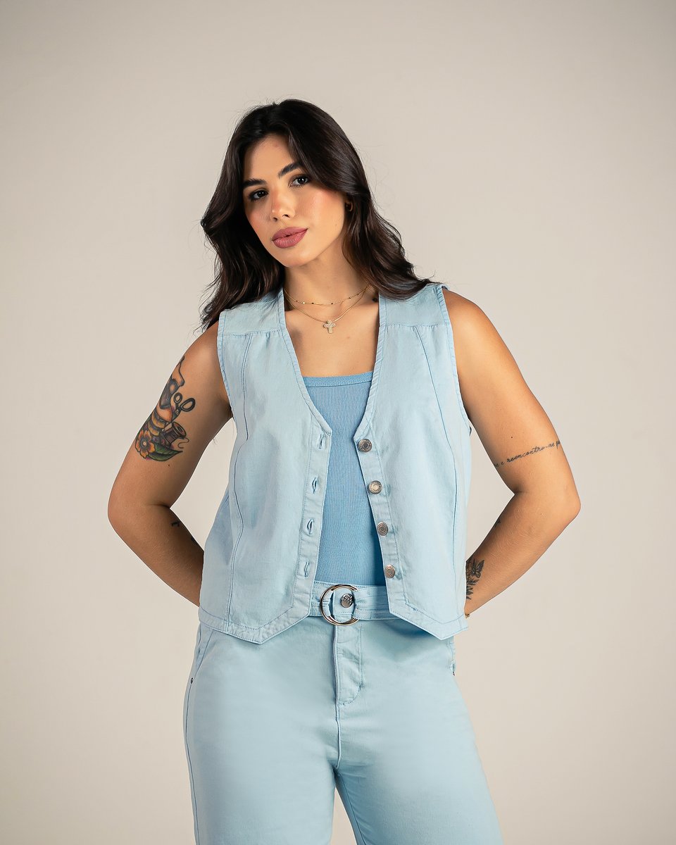 Confeccionado em tecido de alta qualidade, com 98% algodão e 2% elastano, o colete oferece toque macio, excelente caimento e leve elasticidade, garantindo conforto e liberdade de movimento ao longo do dia. Sua modelagem ajustada valoriza a silhueta feminina sem restringir o uso, enquanto a tonalidade azul claro traz leveza, modernidade e fácil combinação com diferentes cores e estilos.