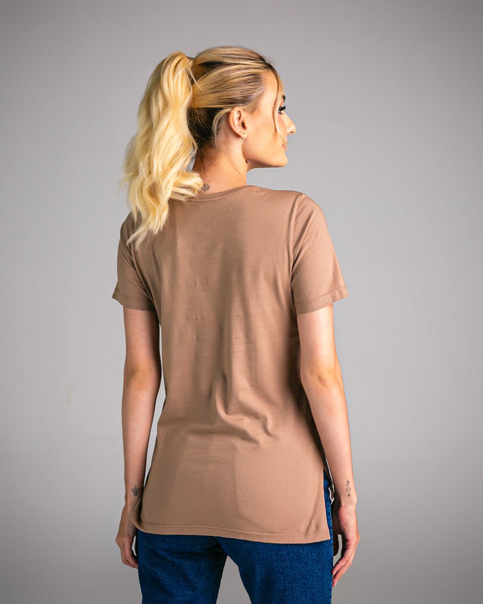 Combine com jeans, shorts, saias ou calças de alfaiataria para criar looks que vão do básico ao casual chic. A t-shirt bege é perfeita para sobreposições com jaquetas, camisas abertas ou coletes, além de funcionar como base para acessórios mais marcantes.